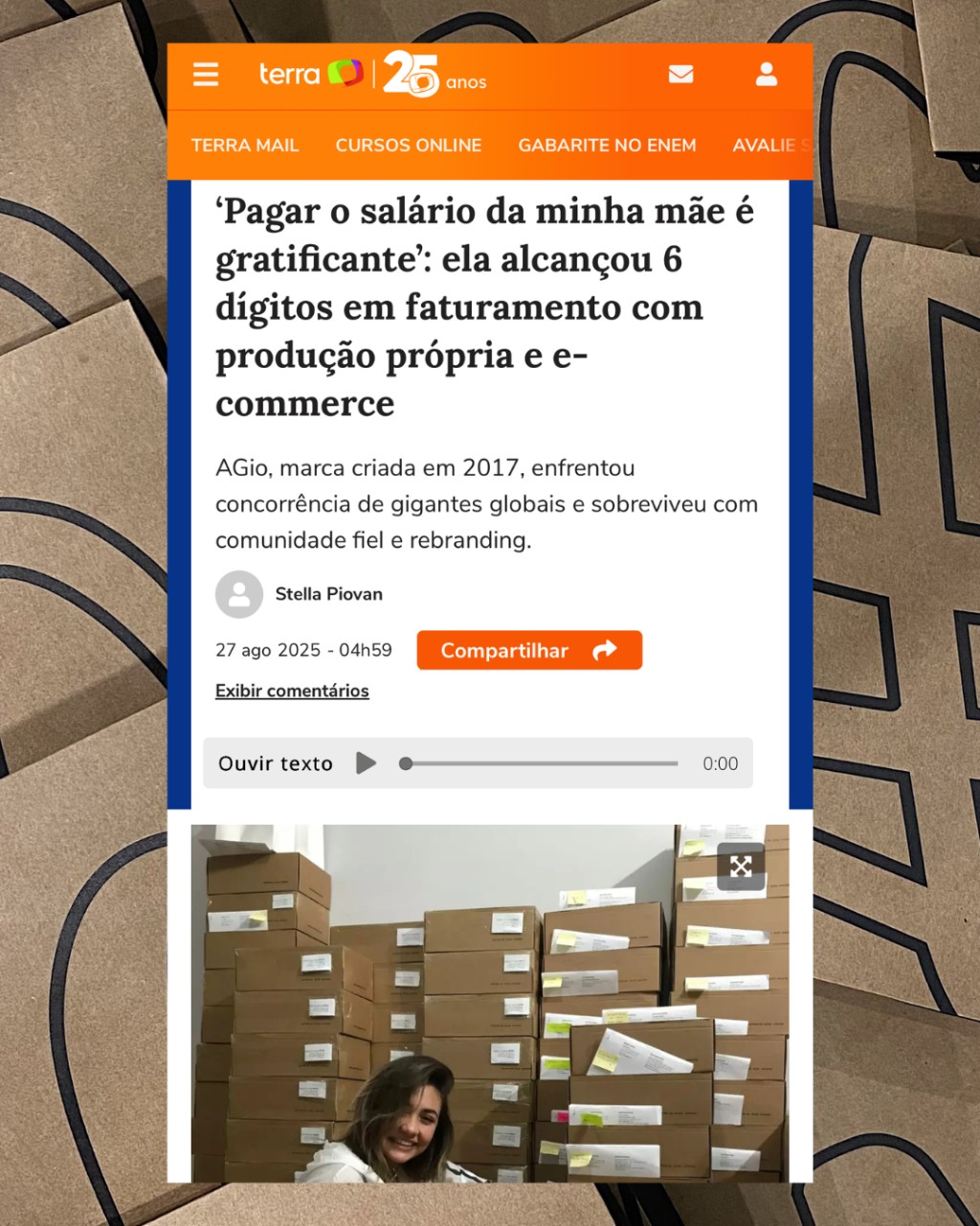 Hoje, aos 29 anos, sou uma mulher que empreende há oito anos no universo digital. Sou expansiva, mas também tímida. Amo café, amo shows, amo museus, amo observar. O lançamento da AGio aconteceu durante um show do Metallica no Lollapalooza. Quem diria. Um sonho que parecia tão distante se materializando no meio da música, da multidão, da vida acontecendo. Eu, uma garota comum, vivendo algo extraordinário.