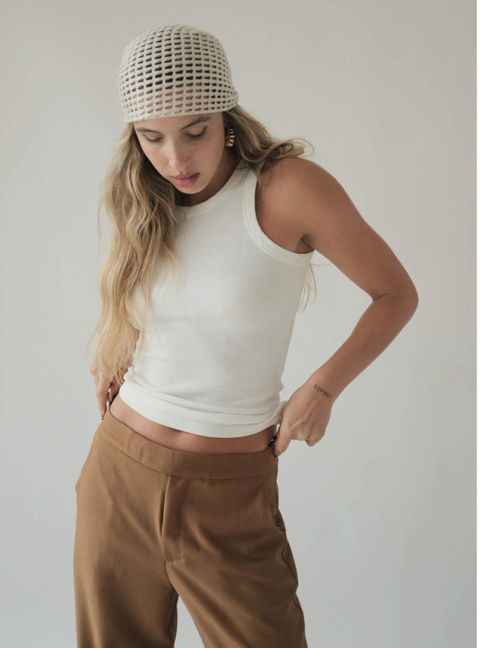 Com modelagem tradicional, alças largas e decote arredondado, seu acabamento canelado garante conforto e elegância em qualquer ocasião — do look pós-mar à rotina na cidade.